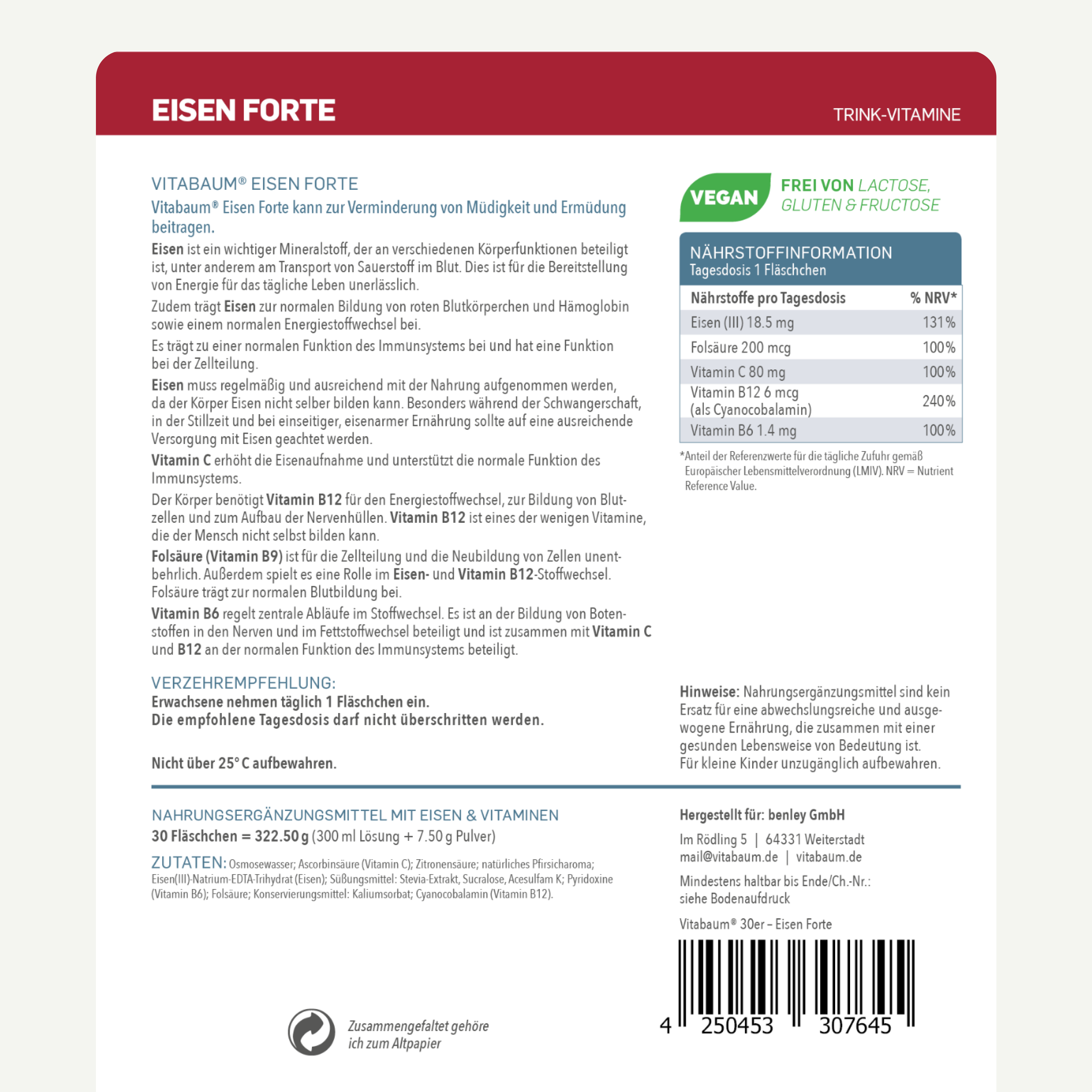 Zutaten: Osmosewasser; Ascorbinsäure (Vitamin C); Zitronensäure; natürliches Zitronenaroma; Eisen (III)-Natrium-EDTA-Trihydrat (Eisen); Süßungsmittel: Stevia-Extrakt, Sucralose, Acesulfam K; Pyridoxin (Vitamin B6); Folsäure; Konservierungsmittel: Kaliumsorbat; Cyanocobalamin (Vitamin B12).