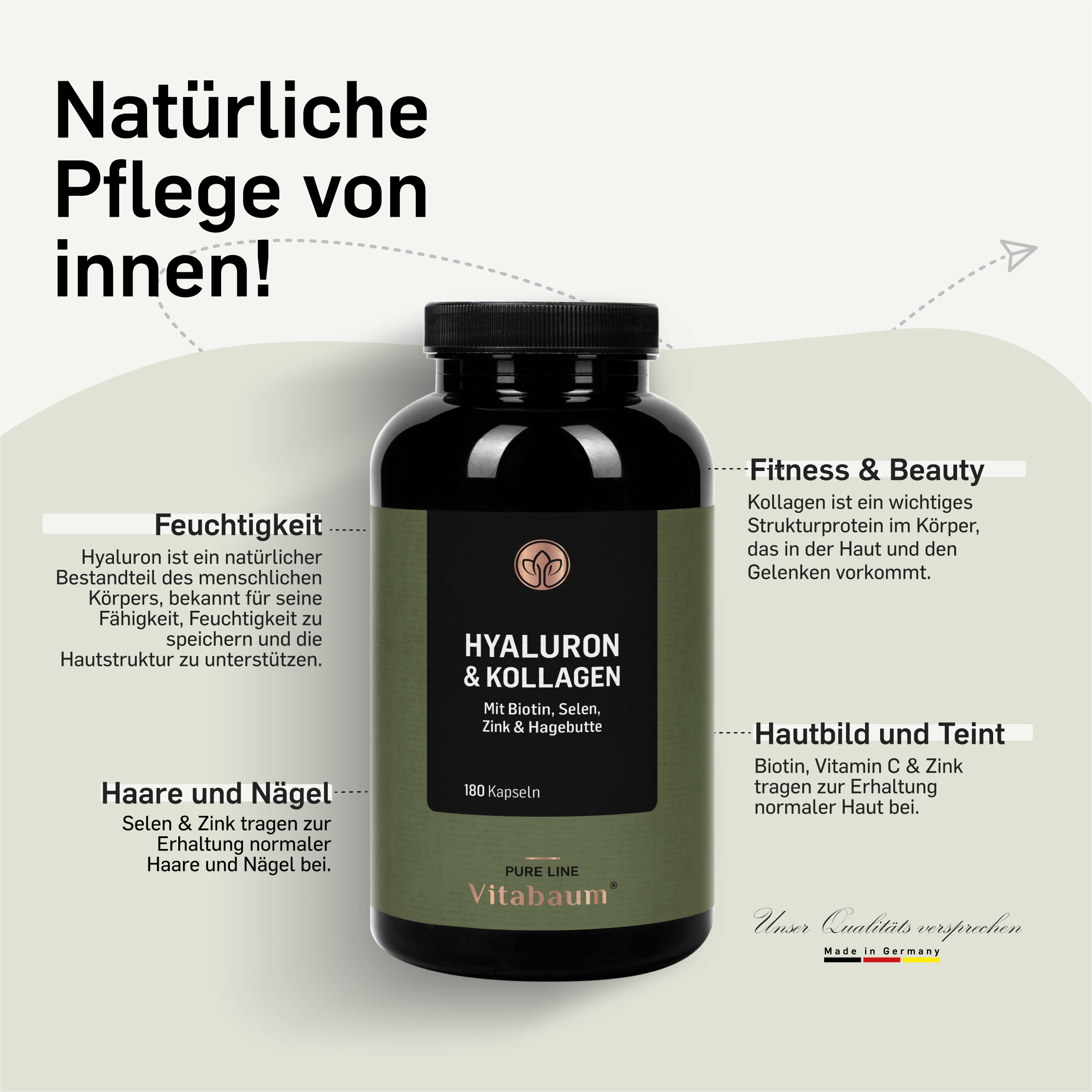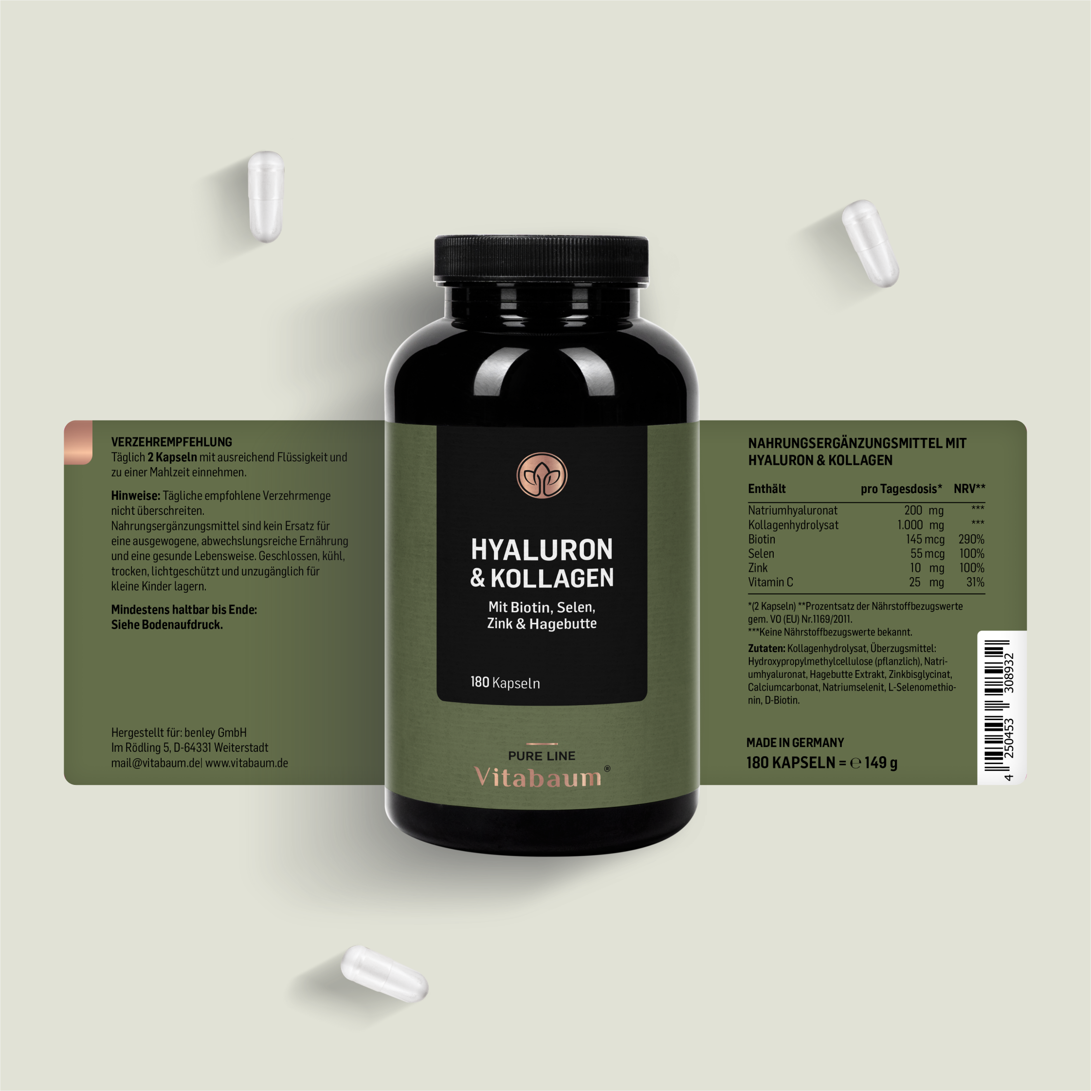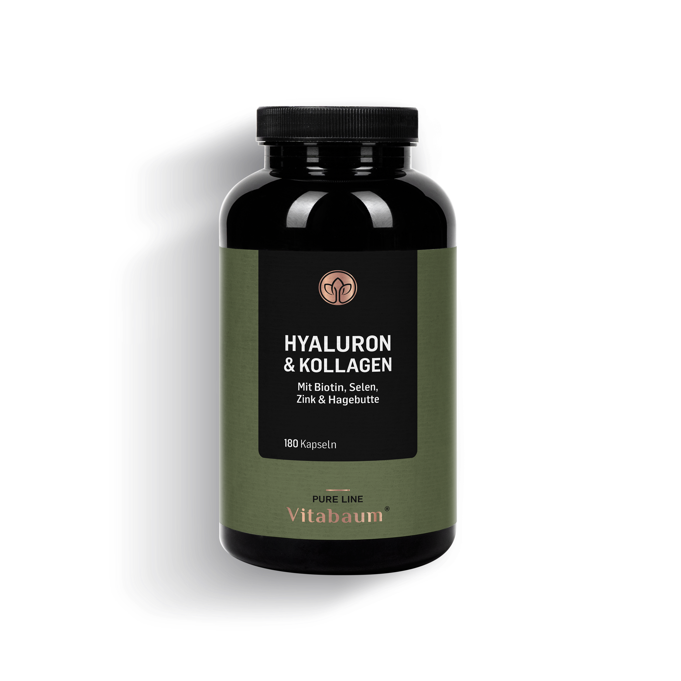 Unser Hyaluron & Kollagen Komplex kombiniert sieben essenzielle Vitalstoffe, die dazu beitragen, deine allgemeine Gesundheit zu unterstützen. Hyaluron hilft, die Feuchtigkeit der Haut zu erhalten und die Gelenkflüssigkeit zu unterstützen. Kollagen ist bekannt für seine Rolle in der Hautgesundheit. Biotin trägt zur Erhaltung normaler Haut bei, während Vitamin C und Zink die Zellen vor oxidativem Stress schützen können. Selen ergänzt den antioxidativen Schutz und trägt zur normalen Funktion des Immunsystems bei.