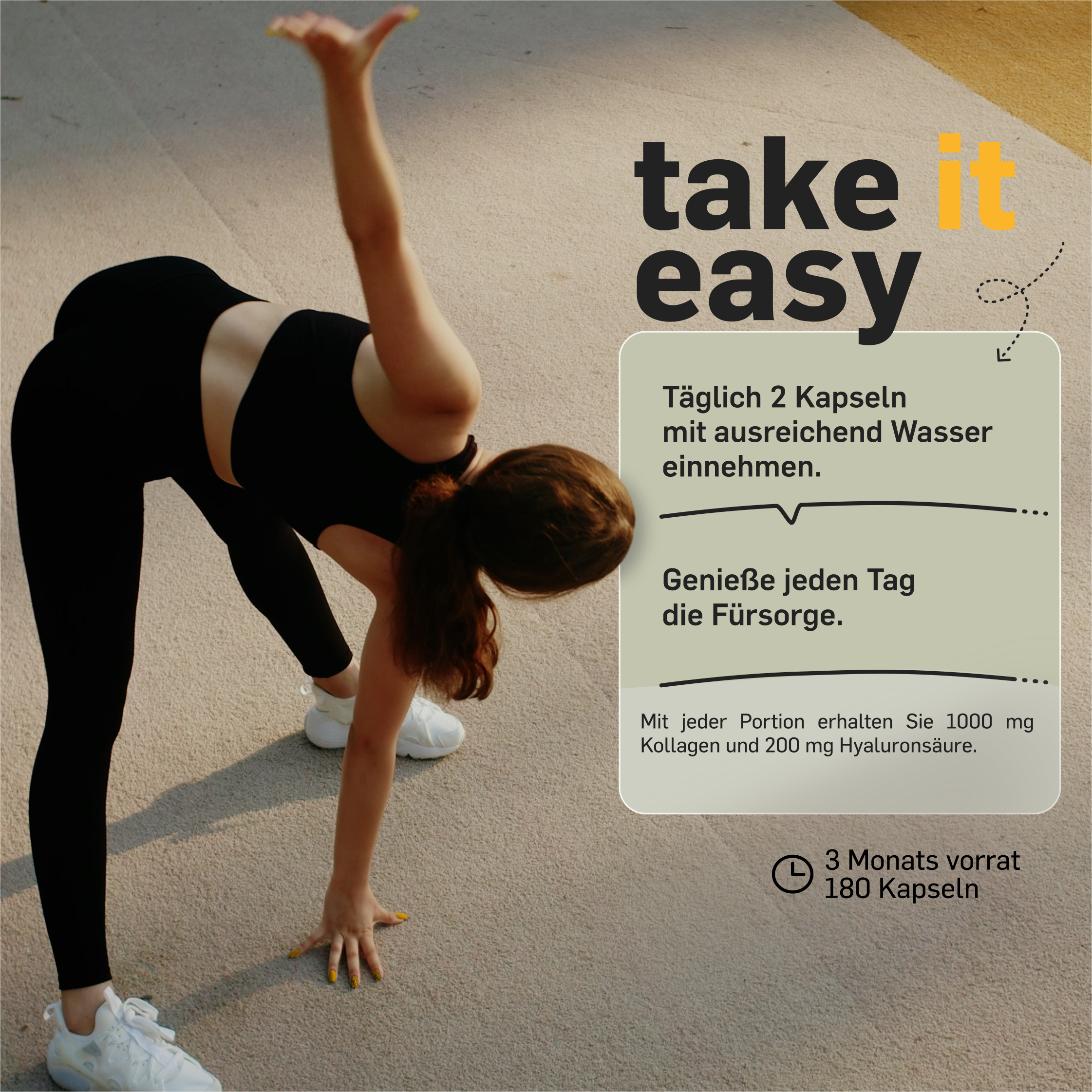 Gib deiner Haut, dem größten und widerstandsfähigsten Organ deines Körpers, die beste Pflege: Die Unterstützung von Hyaluron und Kollagen, die für ihre frische Erscheinung und die Unterstützung deiner Gelenke bekannt sind. Wenn die natürliche Produktion dieser Stoffe im Körper abnimmt, ist unser Hyaluron & Kollagen Komplex genau das Richtige. Mit einer sinnvollen Mischung aus fünf weiteren wertvollen Inhaltsstoffen, darunter das hautfreundliche Biotin und das schützende Antioxidans Zink, trägt unsere Formel dazu bei, dass du dich rundum wohlfühlst.
