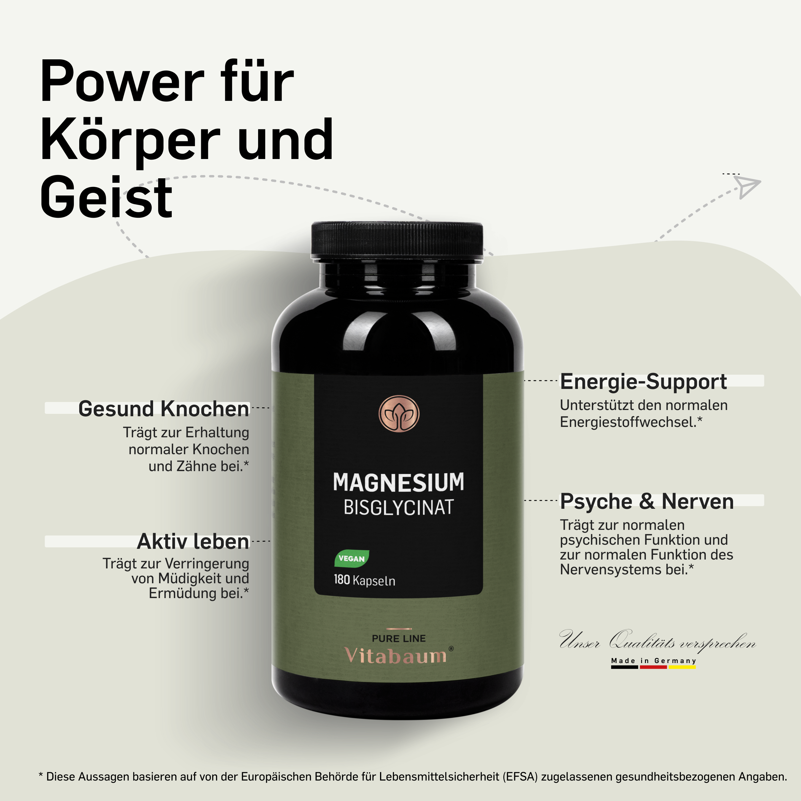 Magnesium ist ein essentielles Mineral, das zahlreiche Vorteile für dein Nervensystem und geistiges Wohlbefinden bietet. *Magnesium unterstützt die normale Funktion des Nervensystems und trägt zur psychischen Ausgeglichenheit bei. In seiner Form als Magnesiumbisglycinat, verbunden mit der Aminosäure L-Glycin, ist es besonders gut verträglich und hoch bioverfügbar, was die effizientere Aufnahme im Körper unterstützt.