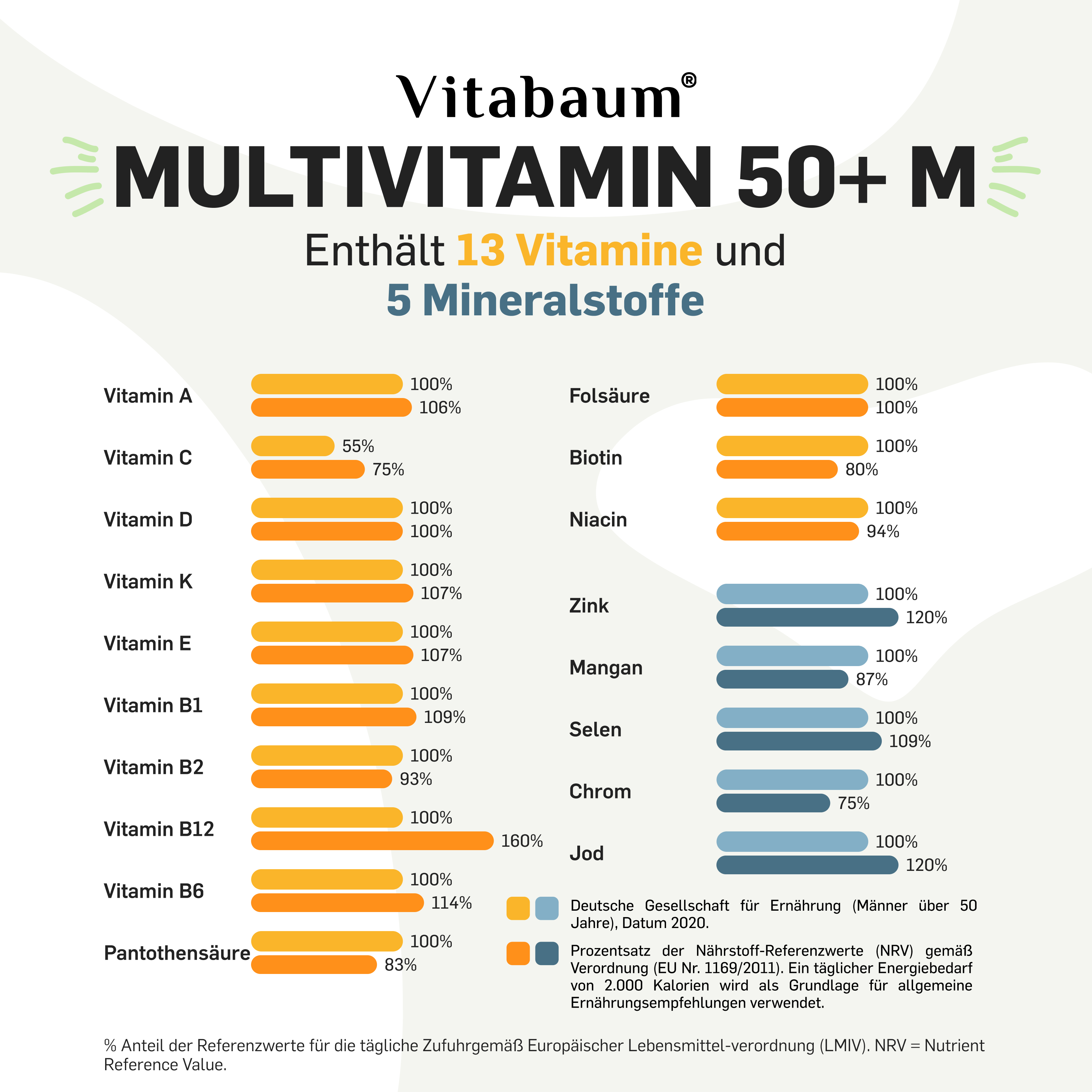 | Nährstoffe | pro Tagesdosis | NRV Männer(50+)˚ | NRV* |