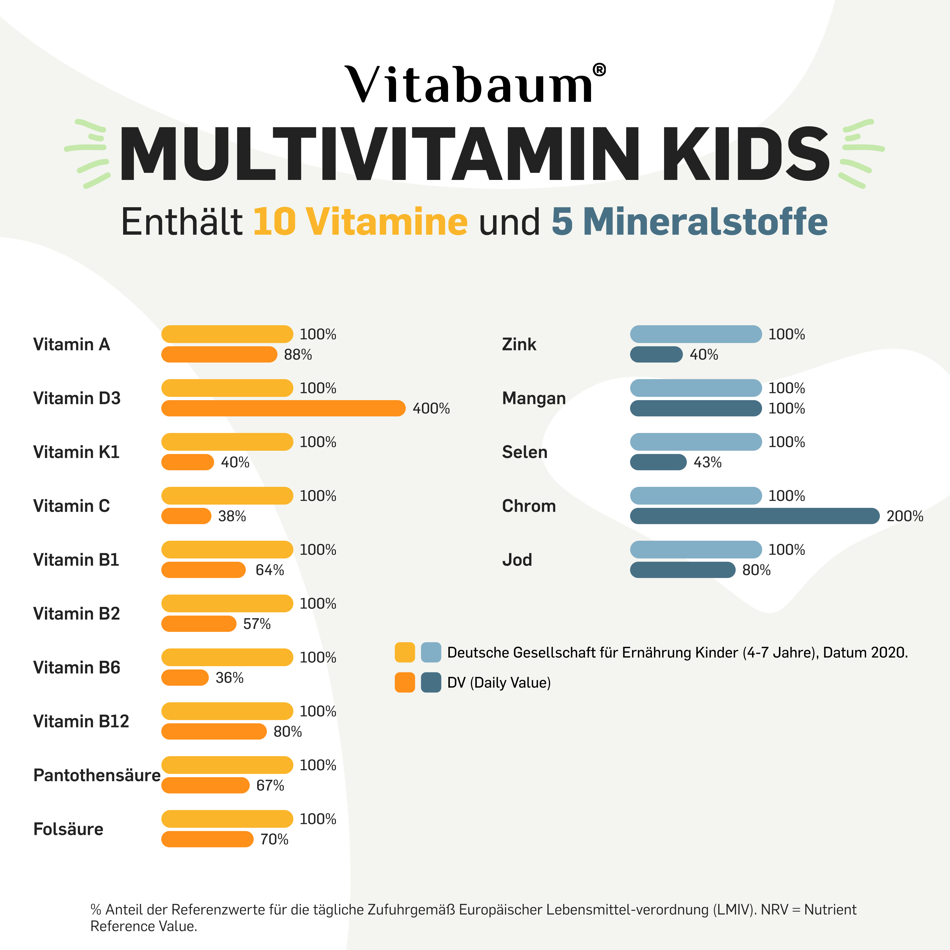 | Nährstoffe | pro Tagesdosis | NRV Kids(4-7)˚ | NRV* |