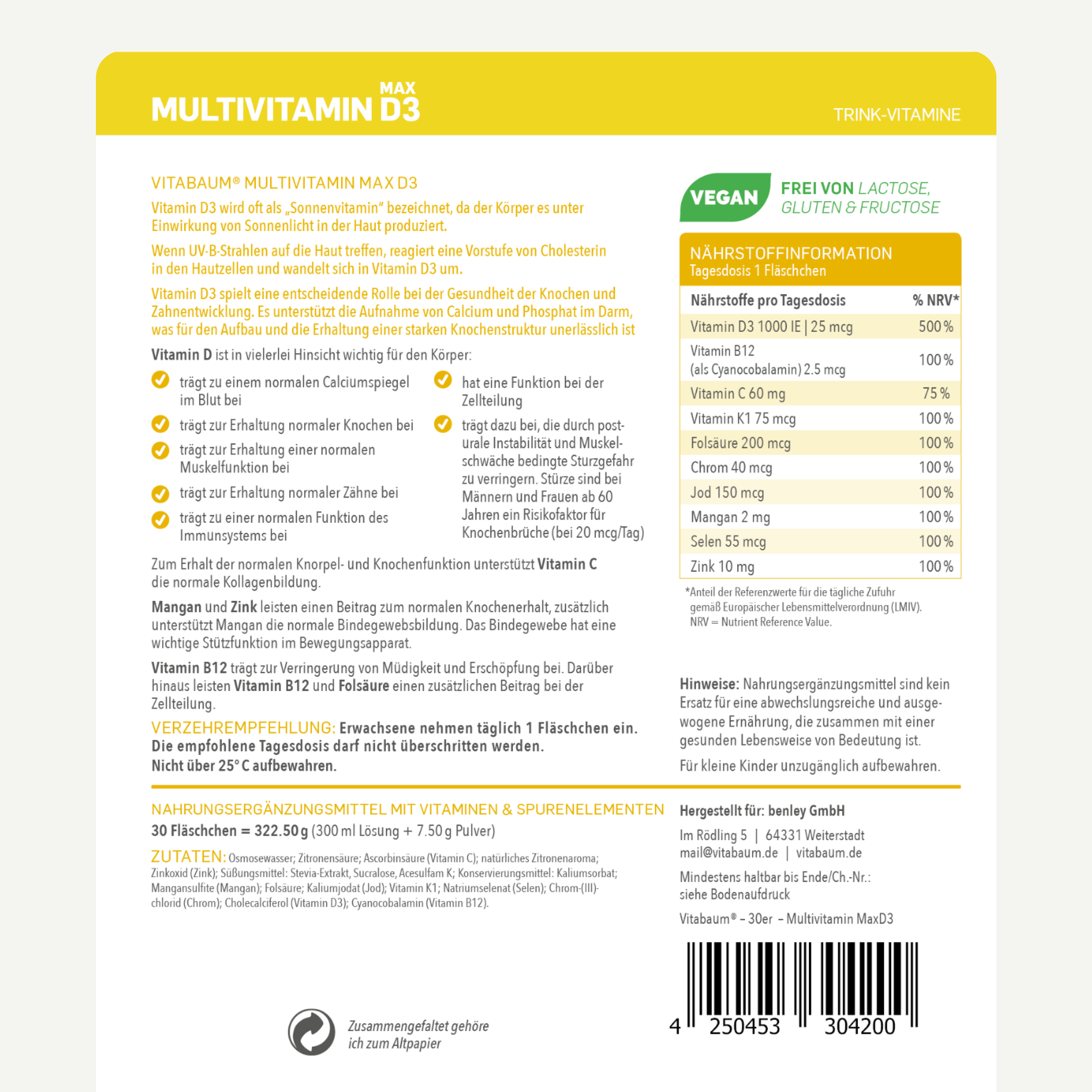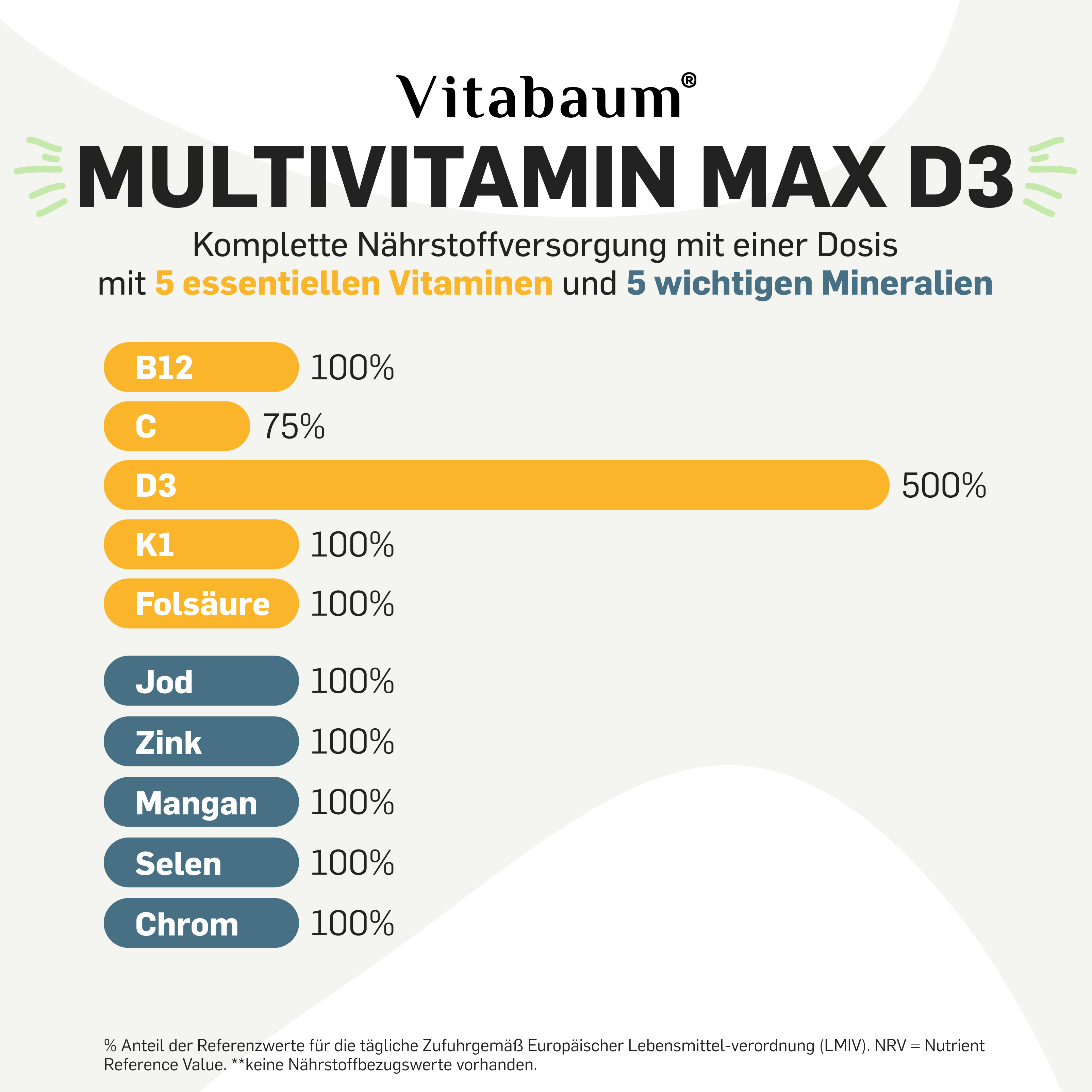 Gerade bei einem hektischen Lebensstil oder besonderen Ernährungsgewohnheiten kann es herausfordernd sein, alle wichtigen Vitamine und Mineralstoffe über die Nahrung aufzunehmen. Multivitamin Max D3 hilft dir dabei, deine tägliche Nährstoffzufuhr gezielt zu ergänzen.