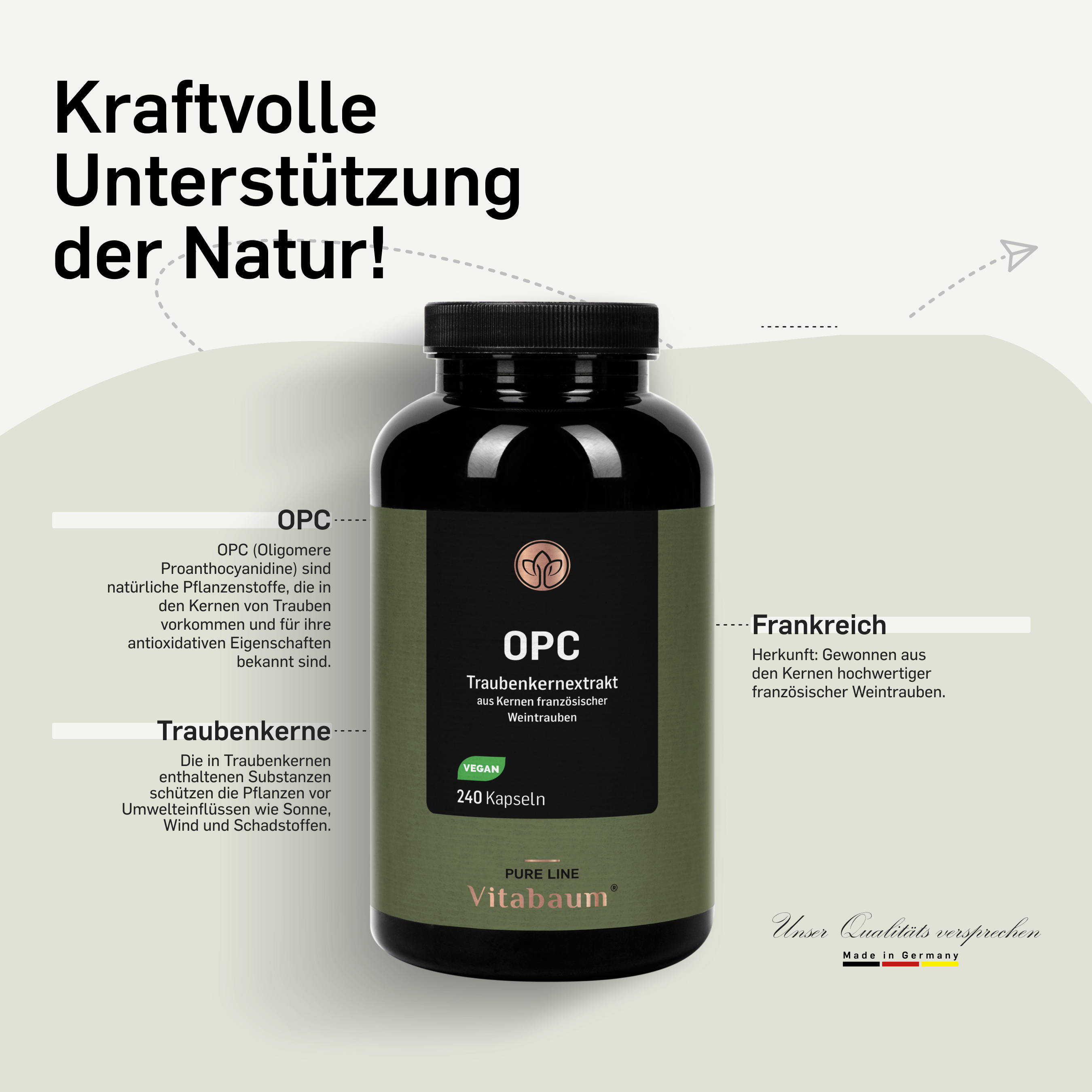 OPC steht für Oligomere Proanthocyanidine – das sind sekundäre Pflanzenstoffe, die natürlicherweise in den Kernen und Schalen von Trauben vorkommen.