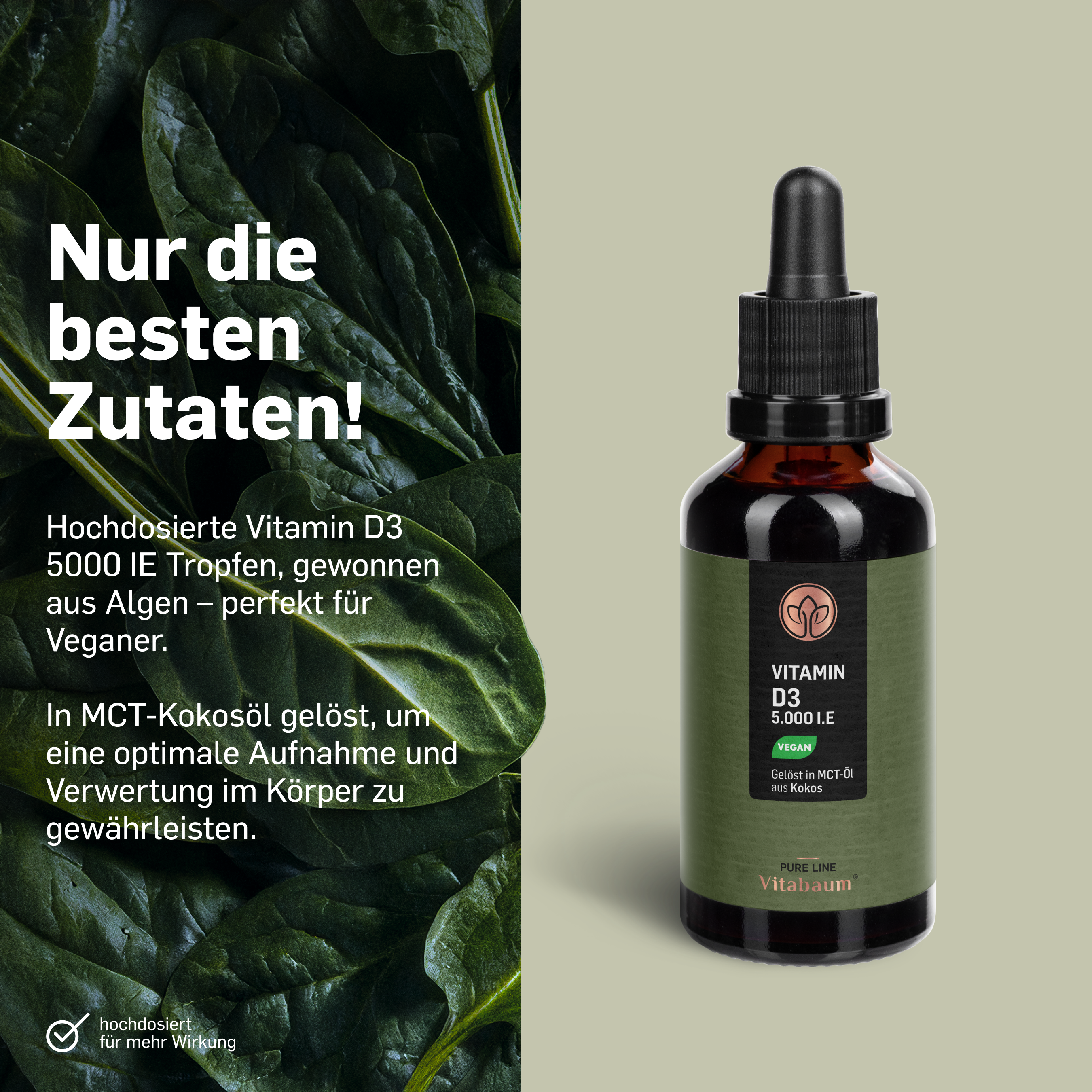Vitabaum D3 5000 vegan bietet dir eine hochdosierte Versorgung mit Vitamin D3 – ganz ohne tierische Bestandteile.