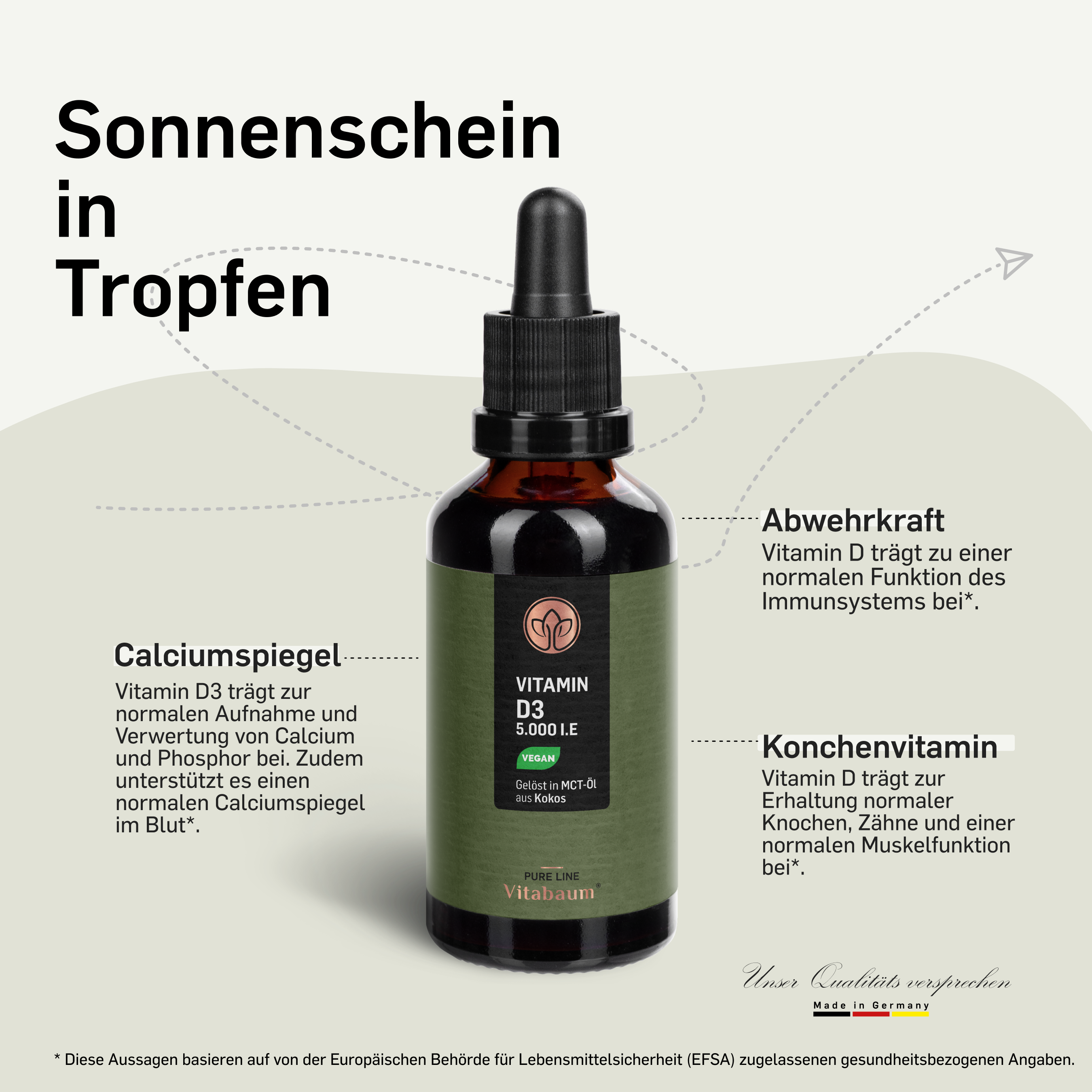 Ich hatte eine Magenbypass Operation und bin daher auf zusätzliche Supplimente wirklich angewiesen.Sie sind so hoch dosiert, dass man circa alle 5Tage NUR EINEN Tropfen nehmen soll.Ich benötige ungefähr das doppelte und nehme daher alle 2-3Tage einen Tripfen.BITTE, MORGENS nehmen....Ich habe die Gropfen gegen Nachmittag benutzt und konnte die in der Nacht sehr schlecht schlafen.Aber einfach, weil ich NICHT Müde geworden bin.Erstens habe ich gemerkt, wie leer meine Depots anscheinend waren und gleichzeitig, WIE WIRKUNGSVOLL die Tropfen doch sind.Es war wie ein Energieschub, bloß OHNE Nebenwirkungen, wie man sie zum Beispiel von zuviel Kaffee/Energydrinks etc.bekommt.Ich hätte NIEMALS damit gerechnet, was EIN EINZIGER Tropfen ausmacht.Aufgrund der Tatsache, dass bestimmte Vitamine etc.zukpnftig wohl von der EU reguliert etc.wrfen sollen, ist es nur ratsam, sich einige Vorräte anzulegen.Mit den Vitamin D3 Tropfen 5000 i.E. von Vitabaum problemlos zu realisieren, da die Tropfen mindestens 2Jahre haltbar sind.Wirklich wirklich nur zu empfehlen, bin einfach begeistert.Achtet auf Eire Gesundheit 🫶🏼🙏🏼