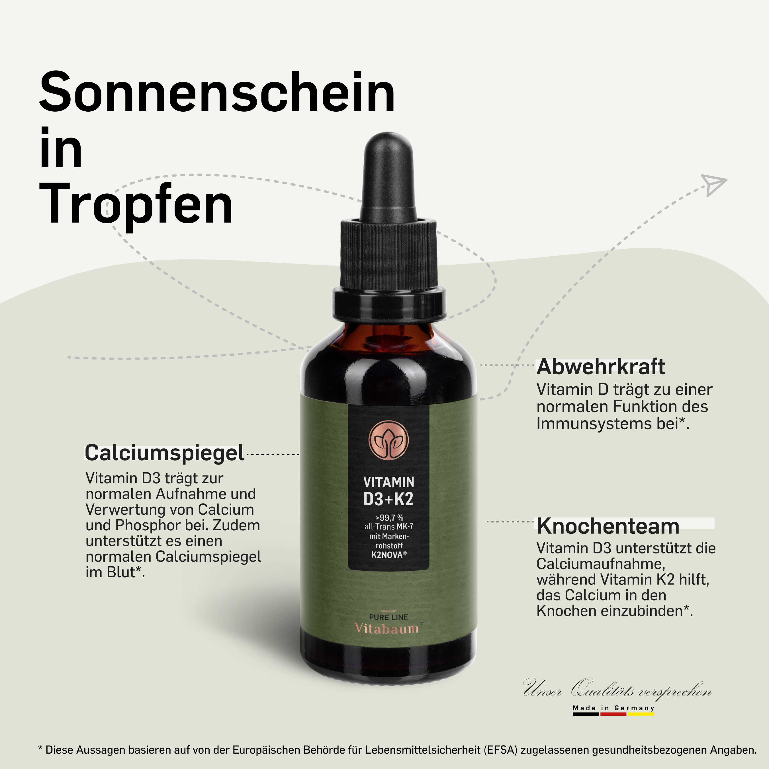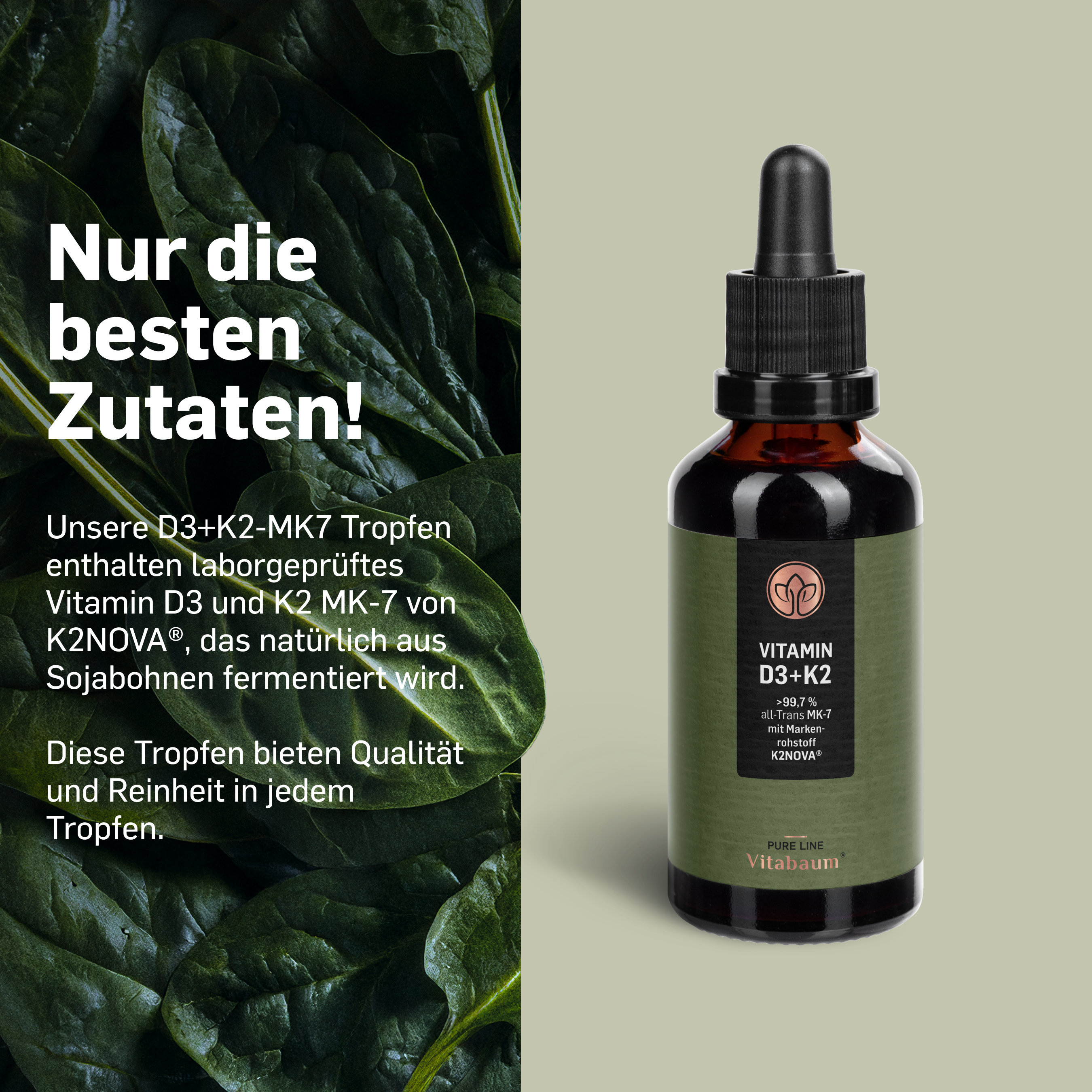 Die Tropfen enthalten Vitamin D3 (Cholecalciferol) und das Vitamin K2 des Markenrohstoffs K2NOVA®, das durch natürliche Fermentation aus Sojabohnen gewonnen wird. Gelöst in MCT-Kokosöl, wird eine hohe Bioverfügbarkeit gewährleistet.